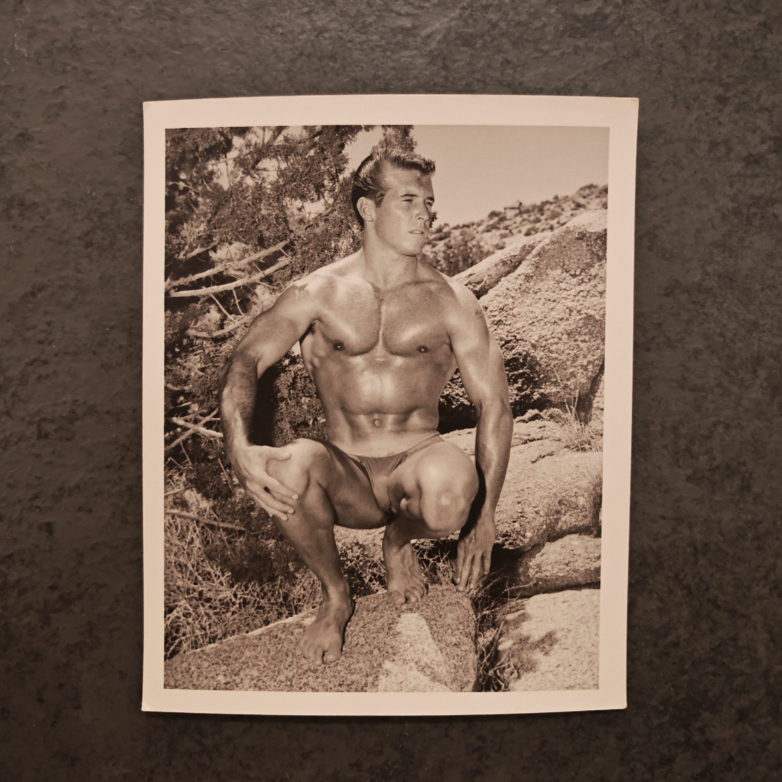 In this composition, Bill Robb performs a crouched “statuesque” pose atop a jagged rock formation. This Vintage Print demonstrates Bellas’s mastery of perspective and anatomical alignment. By positioning the camera at a lower angle, the artist emphasizes the power of the model’s thighs and torso. Furthermore, the surrounding scrub and rock textures provide a tactile contrast to the smooth, oiled skin of the subject. This deliberate juxtaposition reinforces the connection between the idealized human form and the raw power of nature. Consequently, the photograph functions as a sophisticated study of balance, strength, and classical proportion.