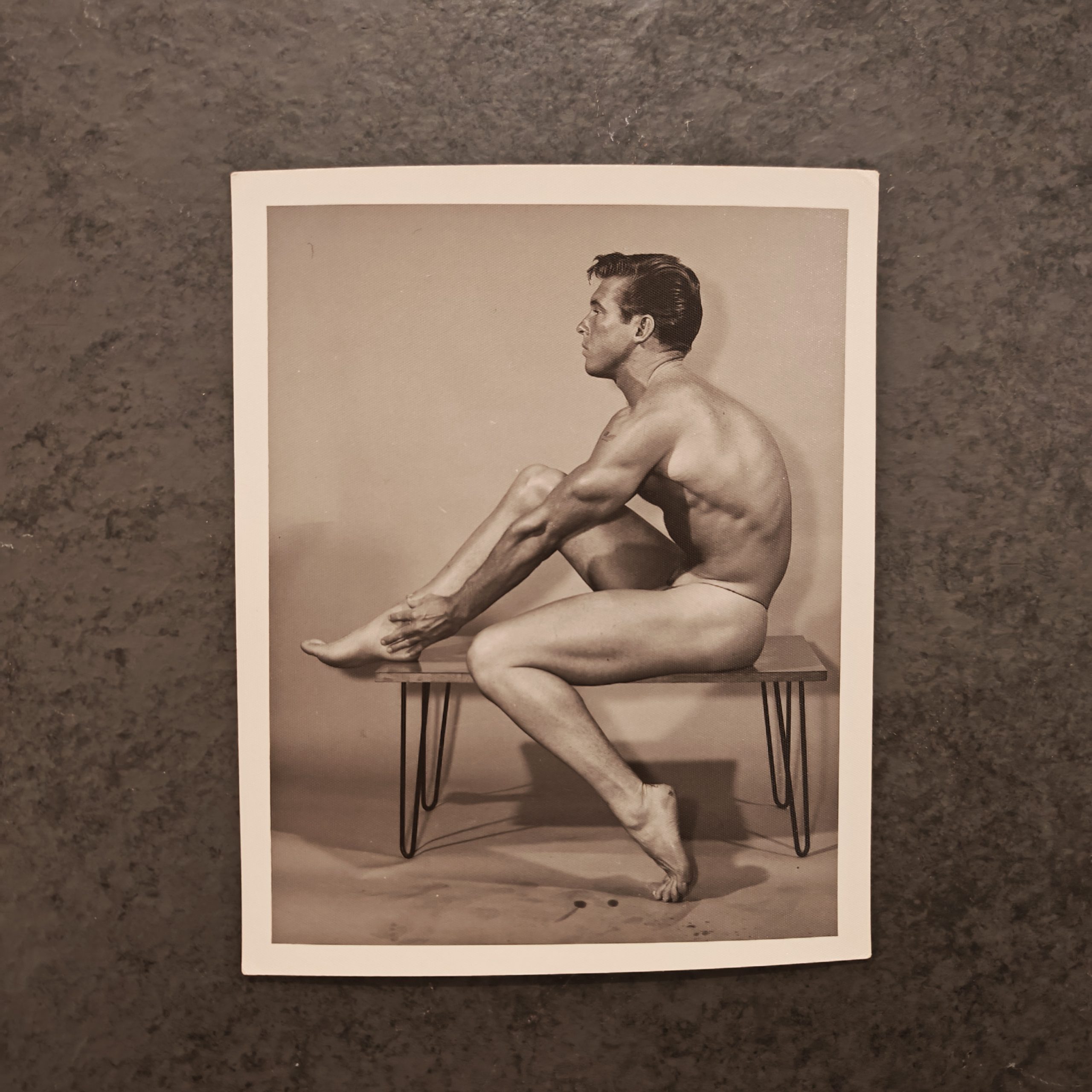 Bruce of Los Angeles print serves as a masterclass in mid-century studio portraiture. Bruce Bellas, the artist behind the legendary “Bruce of Los Angeles” moniker, was instrumental in elevating the male physique to a legitimate subject of fine art photography. By moving away from purely documentary sports photography, Bellas introduced a level of formal elegance that mirrored classical sculpture. This specific work captures Bill Robb, one of the most celebrated models of the 1950s, in a rare seated composition. Furthermore, the image illustrates how Bellas transformed his subjects into icons of American modernism.