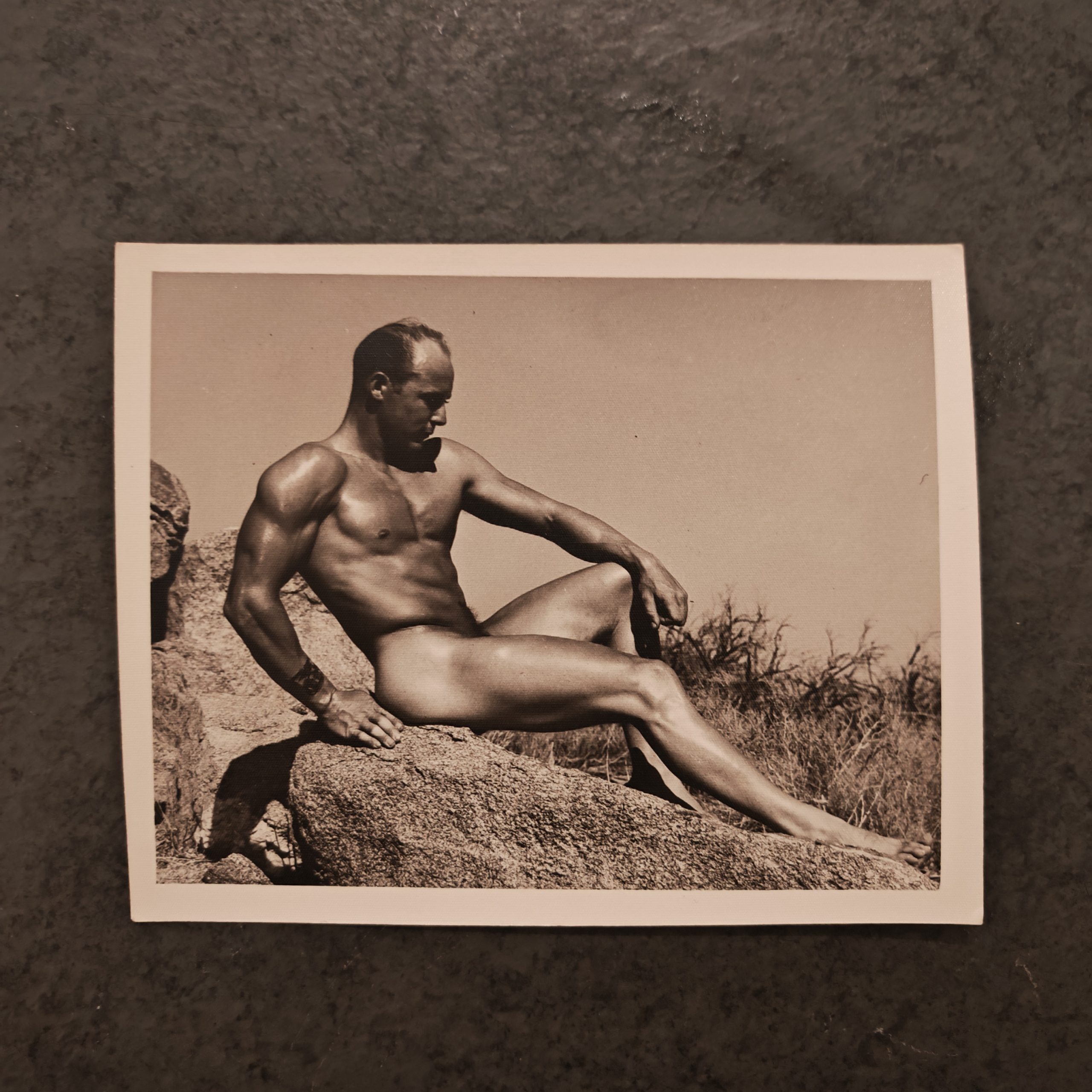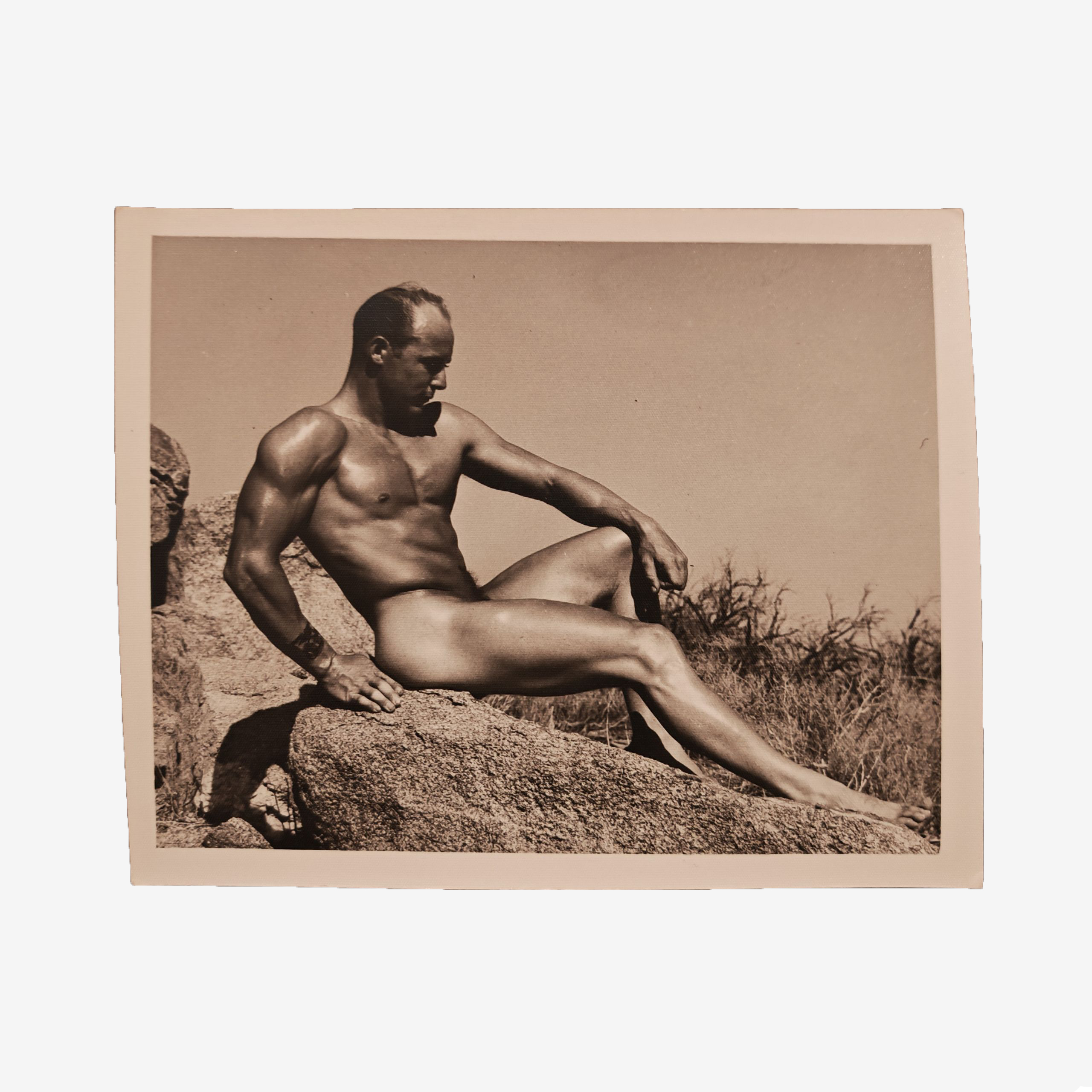 In this 1950 composition, Bellas captures the renowned model John Leist in a serene, seated pose. The artist utilizes the bright California sun to carve out the subject’s musculature, a technique that distinguishes an authentic Bruce of Los Angeles Print. Leist’s relaxed yet powerful posture mirrors the statues of Greco-Roman antiquity. This connection between the modern athlete and classical art history was a recurring theme in Bellas’s work. The sharp focus on the mid-tones highlights the “Bruce” style, characterized by clean lines and an absence of unnecessary clutter.