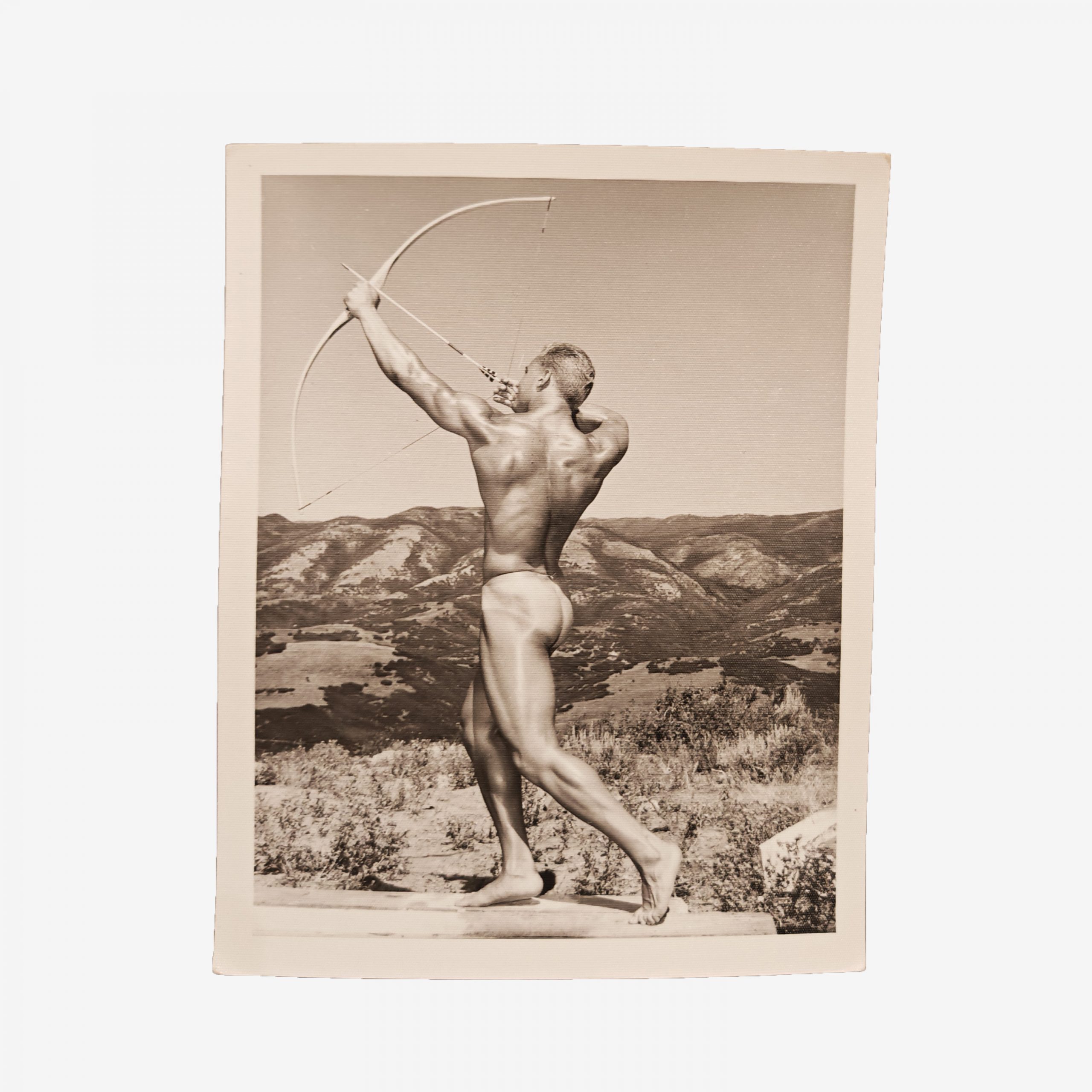 The composition features a model in an archer’s stance, positioned against a vast, mountainous horizon. This Bruce of Los Angeles Series demonstrates Bellas’s ability to use the California landscape as a natural stage. The archer motif connects the modern male form to the heroic traditions of Greco-Roman sculpture. Furthermore, the strong diagonal line created by the bow and the model’s outstretched arm provides a dynamic sense of tension and balance.