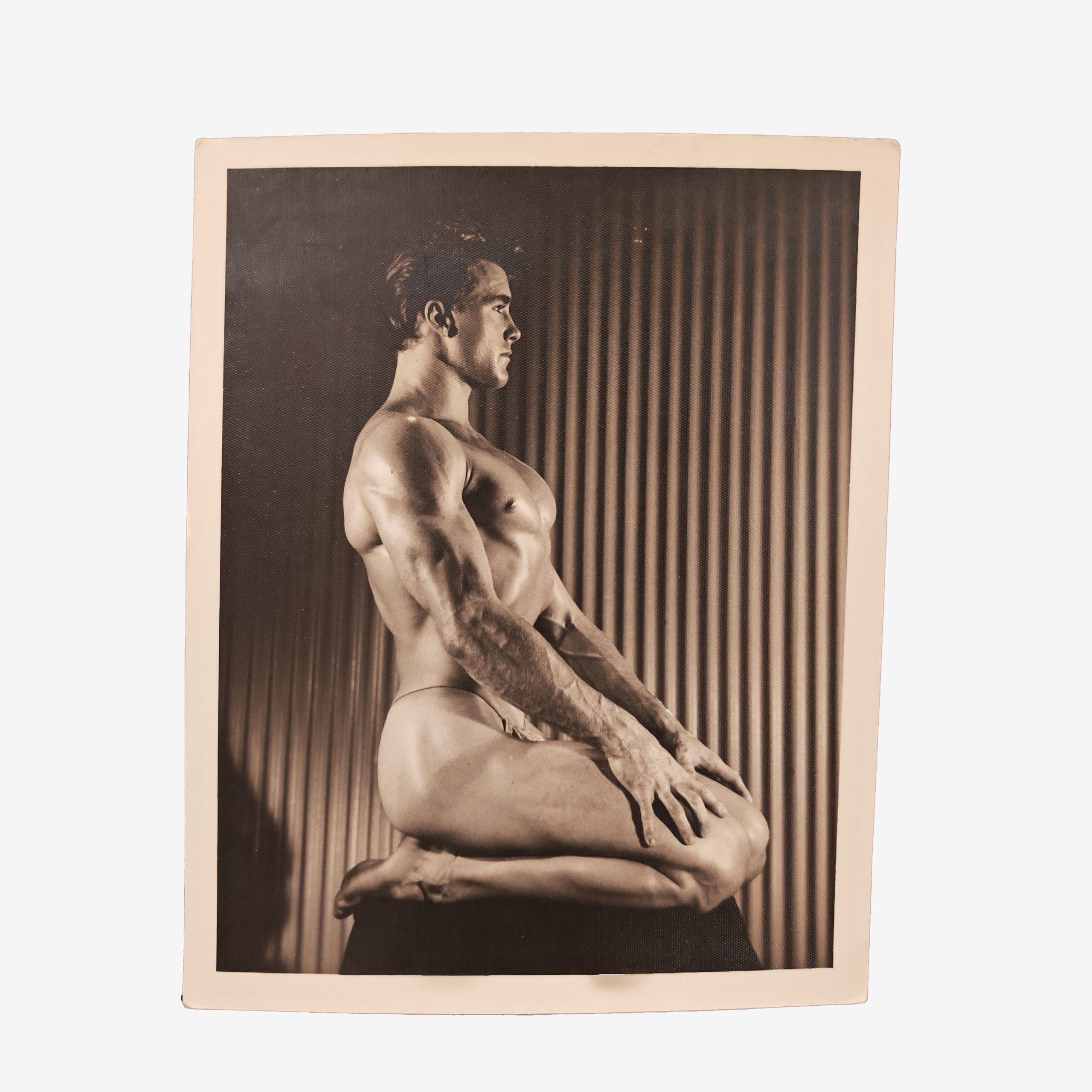 In this 1950 composition, Bellas employs a sophisticated studio setup featuring a corrugated metallic backdrop. This textural choice reflects the industrial and futuristic aesthetic often found in a Bruce of Los Angeles Print. The lighting is sharply directional, casting deep shadows that emphasize Fury’s chest and abdominal definition. This “low-key” lighting technique was a Bellas trademark, designed to simulate the dramatic chiaroscuro of classical painting. Fury’s profile pose demonstrates the perfect symmetry required for physique competition, serving as a masterclass in anatomical study and artistic framing.