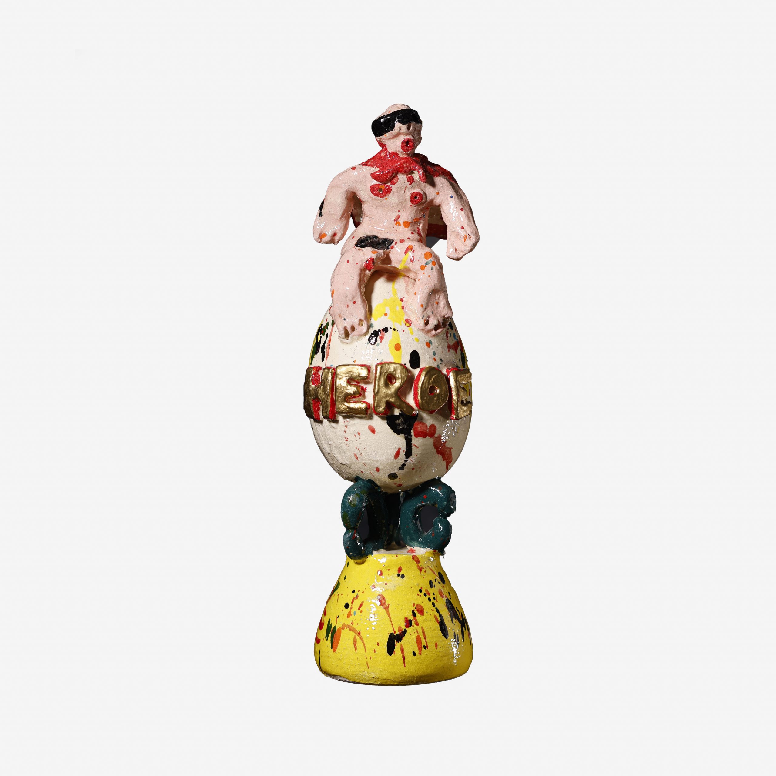 The ceramic sculpture “Heroe” (2024) by Cesc Abad explores irony, fragility, and the theatrical nature of the male figure. The work measures 32.5 x 9.5 x 9.5 cm and is preserved in excellent condition.