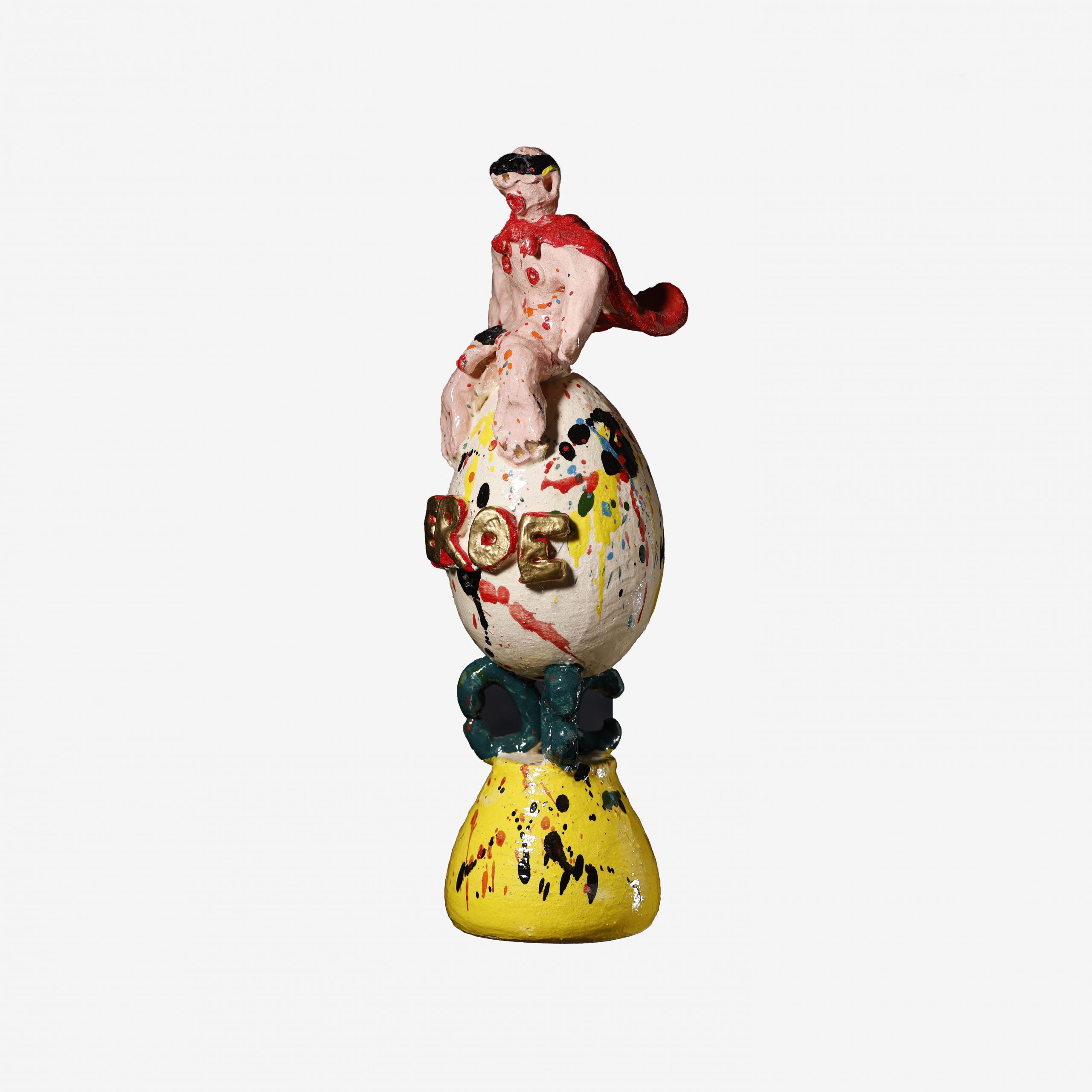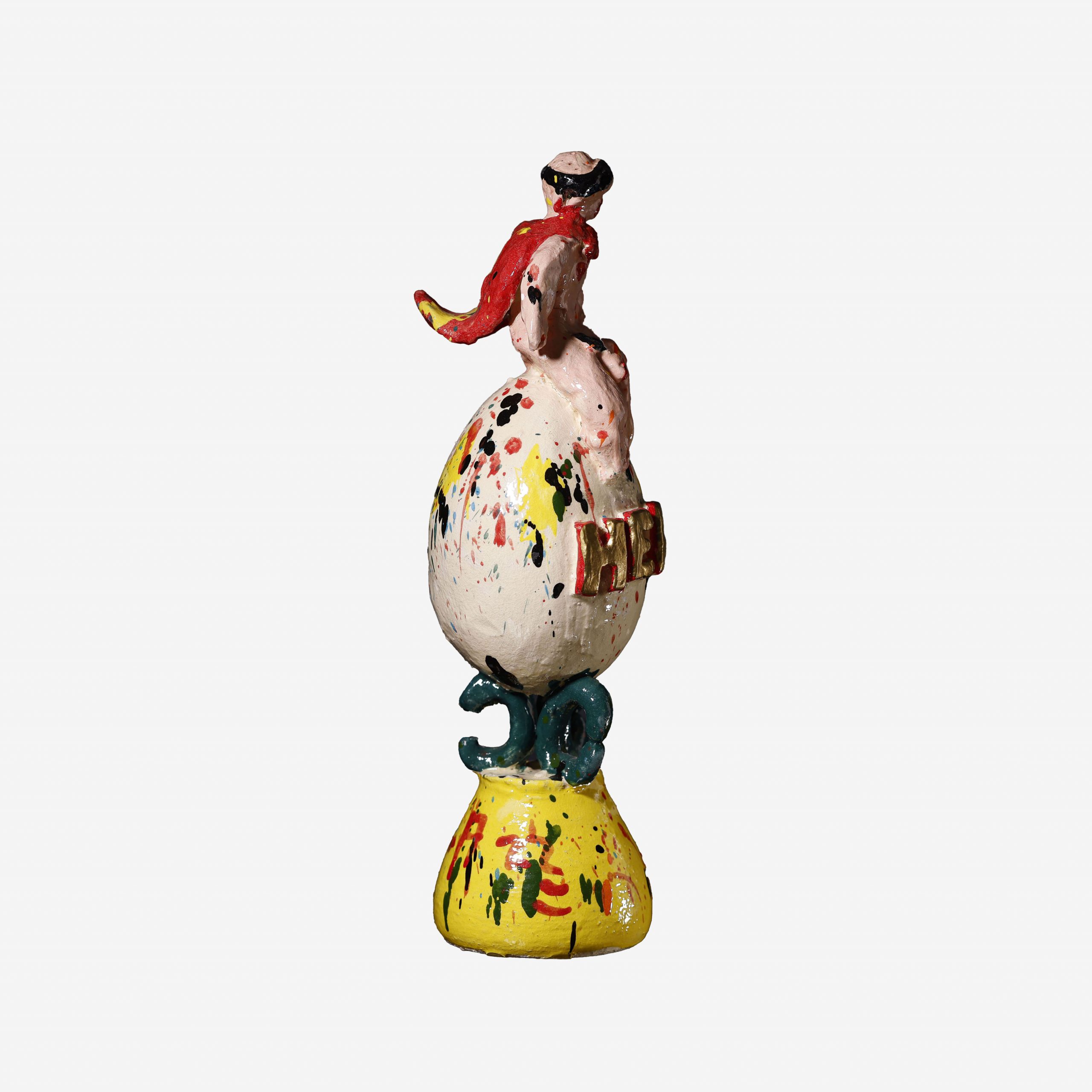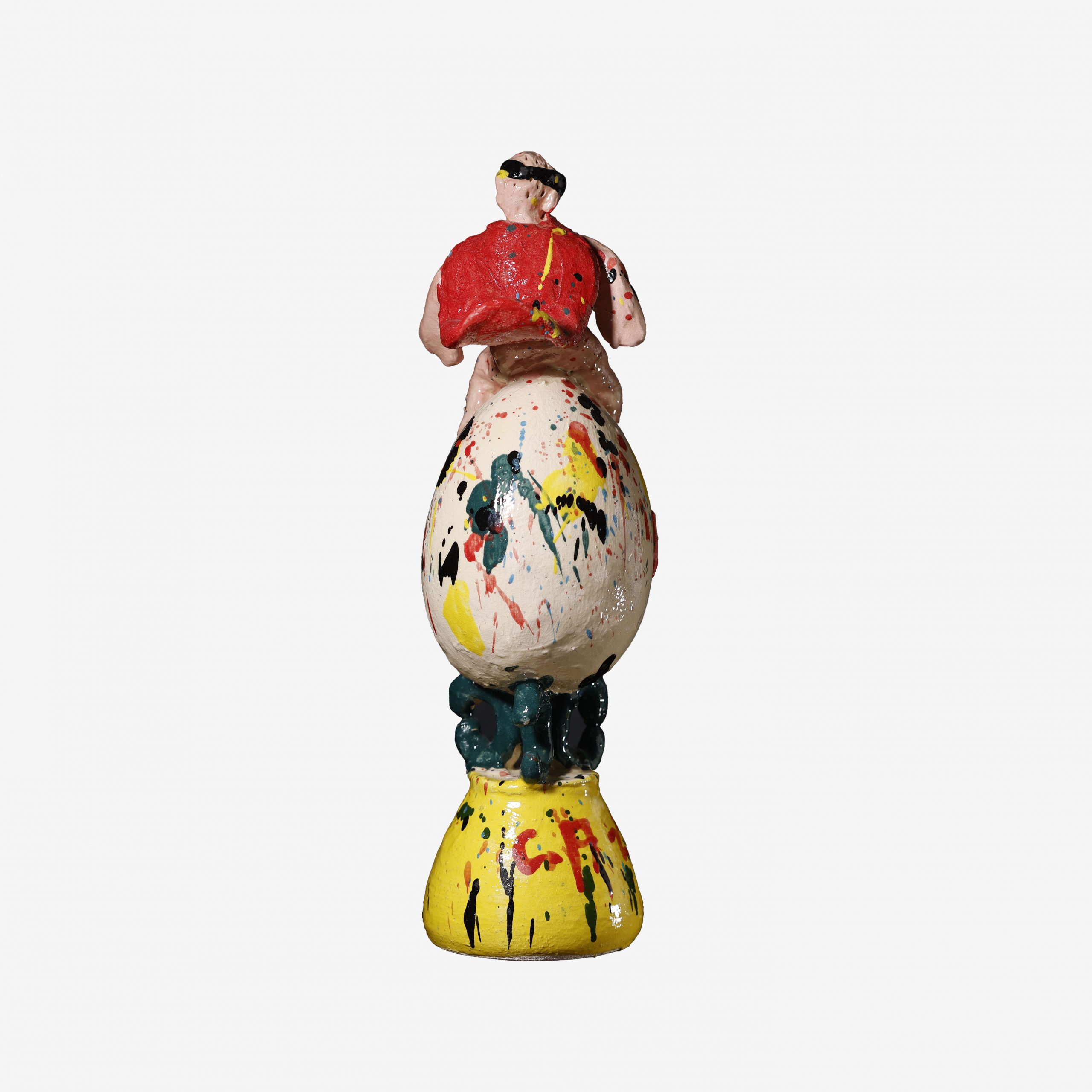 The vivid yellow base, dotted with expressive paint strokes, and the teal ceramic elements holding the egg enhance the sculpture’s playful energy. Abad uses rough, almost childlike modeling, combined with vibrant colors, to echo the spirit of neo-expressionism and art brut. His approach aligns with artists such as Jonathan Meese or Grayson Perry, who use irony and exaggeration to challenge cultural icons.