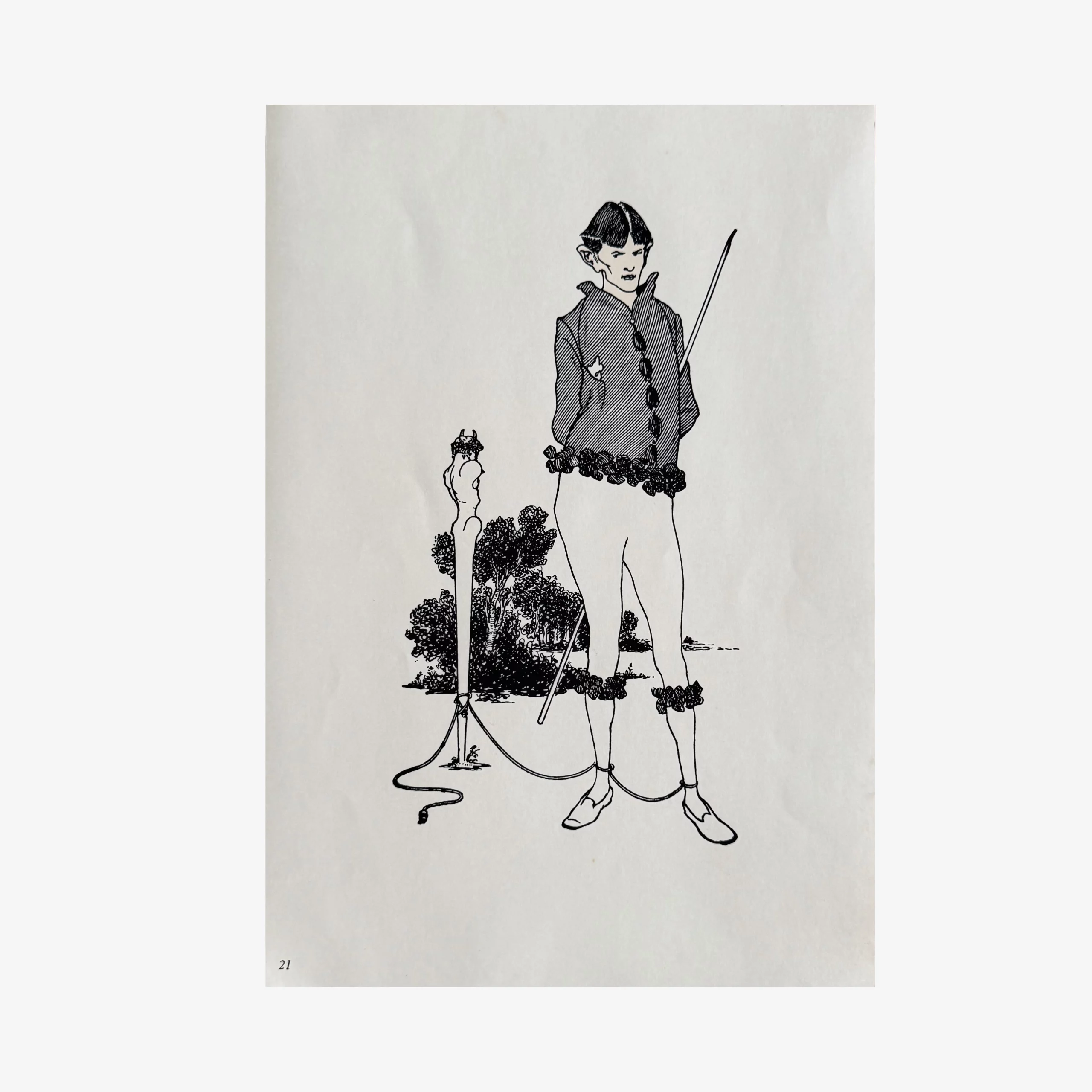 Despite its minimalism, the image carries layers of symbolic tension. The costume resembles a jester’s outfit, while the floral garlands recall pagan fertility rites. At the same time, the cord and the figure’s posture evoke a sense of stylized submission or ritual. This ambiguity, rich in erotic charge and irony, reflects Beardsley’s ability to merge beauty and taboo within a single image.