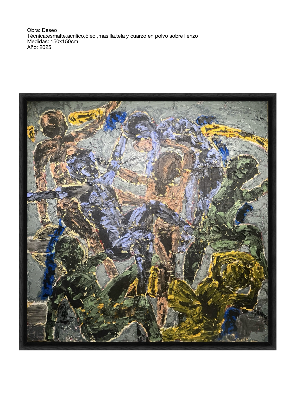 Contemporary Art Héctor López reaches a monumental scale of expression with the 2025 masterpiece titled “DESEO.” This canvas serves as a definitive exploration of the magnetic forces governing human proximity and shared experience. Specifically, the Madrid-based artist utilizes a highly sophisticated and innovative mixed media technique. He expertly fuses enamel, acrylic, and oil with putty and powdered quartz on a heavy-duty canvas support. Because he integrates these diverse mineral and chemical elements, the artwork possesses a rugged, sculptural topography that interacts aggressively with ambient light. Consequently, the surface is not merely a plane for color, but a three-dimensional landscape of texture that demands a physical response from the viewer.