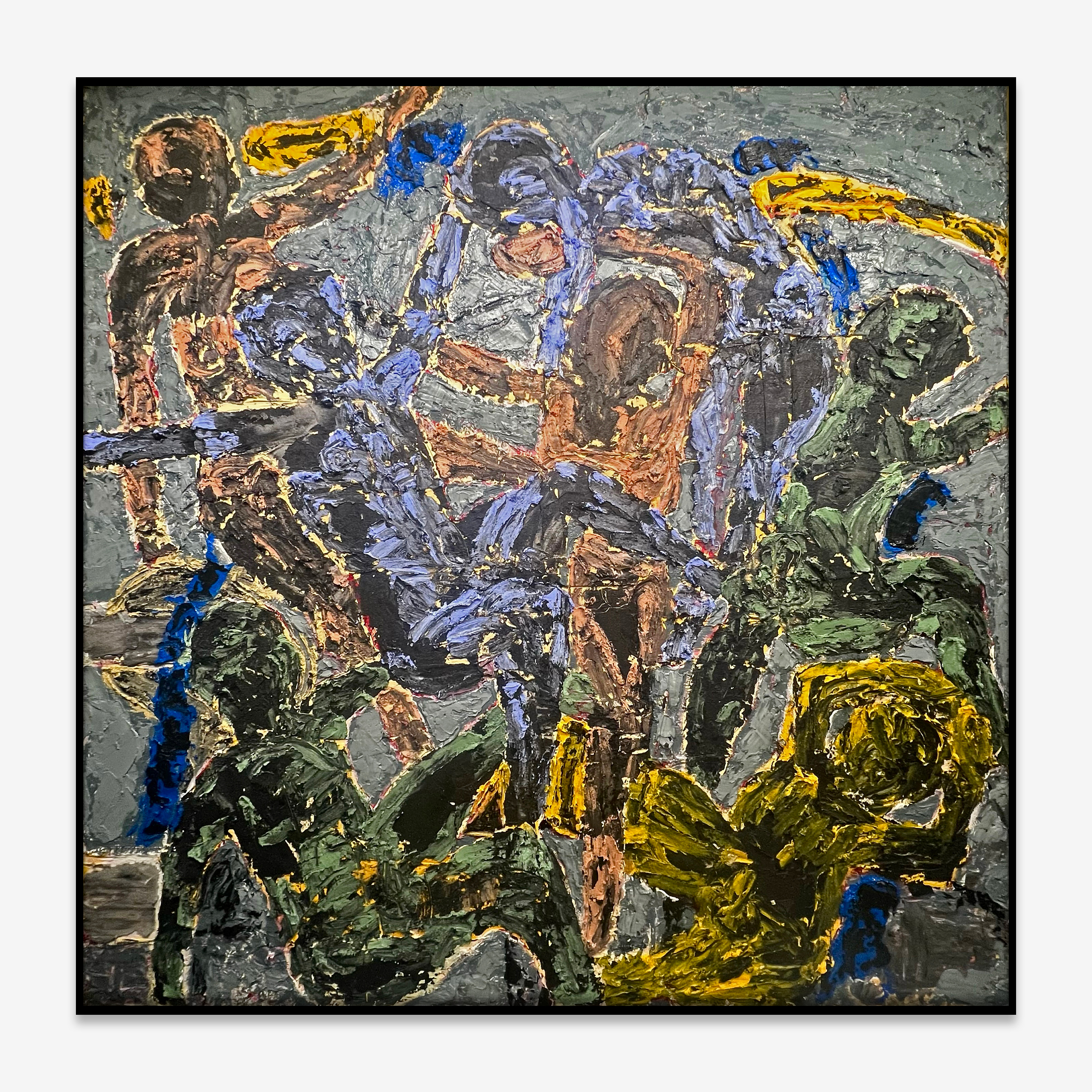 In “DESEO,” the composition features a complex, dynamic interaction of figures emerging from a textured gray ground. This Contemporary Art Héctor López piece utilizes a sophisticated palette of olive greens, deep ochres, and electric blues to define the intertwining forms. Furthermore, the artist uses the contrast between the industrial finish of the enamel and the organic matte quality of the powdered quartz to create a rhythmic visual tension. Instead of relying on traditional anatomical realism, López uses gesture and material accumulation to convey the raw energy of connection. As a result, the work acts as a psychological map, where the thickness of the paint represents the weight of memory and identity.