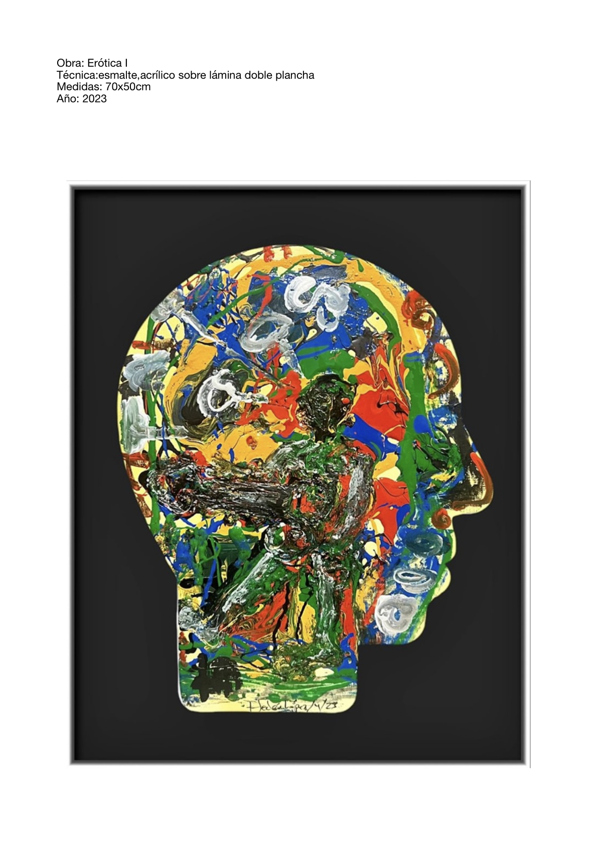Héctor López Fine Art presents a sophisticated exploration of psychological interiority with the 2023 masterpiece titled “ERÓTICA I.” This 70 x 50 cm work represents a critical juncture in the artist’s career, where the silhouette of the human head serves as a vessel for complex, vibrant abstraction. Specifically, the Madrid-based artist utilizes a professional “esmalte y acrílico sobre lámina doble plancha” (enamel and acrylic on double-plate sheet) technique. Because he employs a non-traditional industrial support, the artwork achieves a sleek, reflective surface that enhances the brilliance of the pigments. Consequently, this material choice positions the work at the intersection of contemporary design and fine art, offering a durable and innovative aesthetic for modern collections.