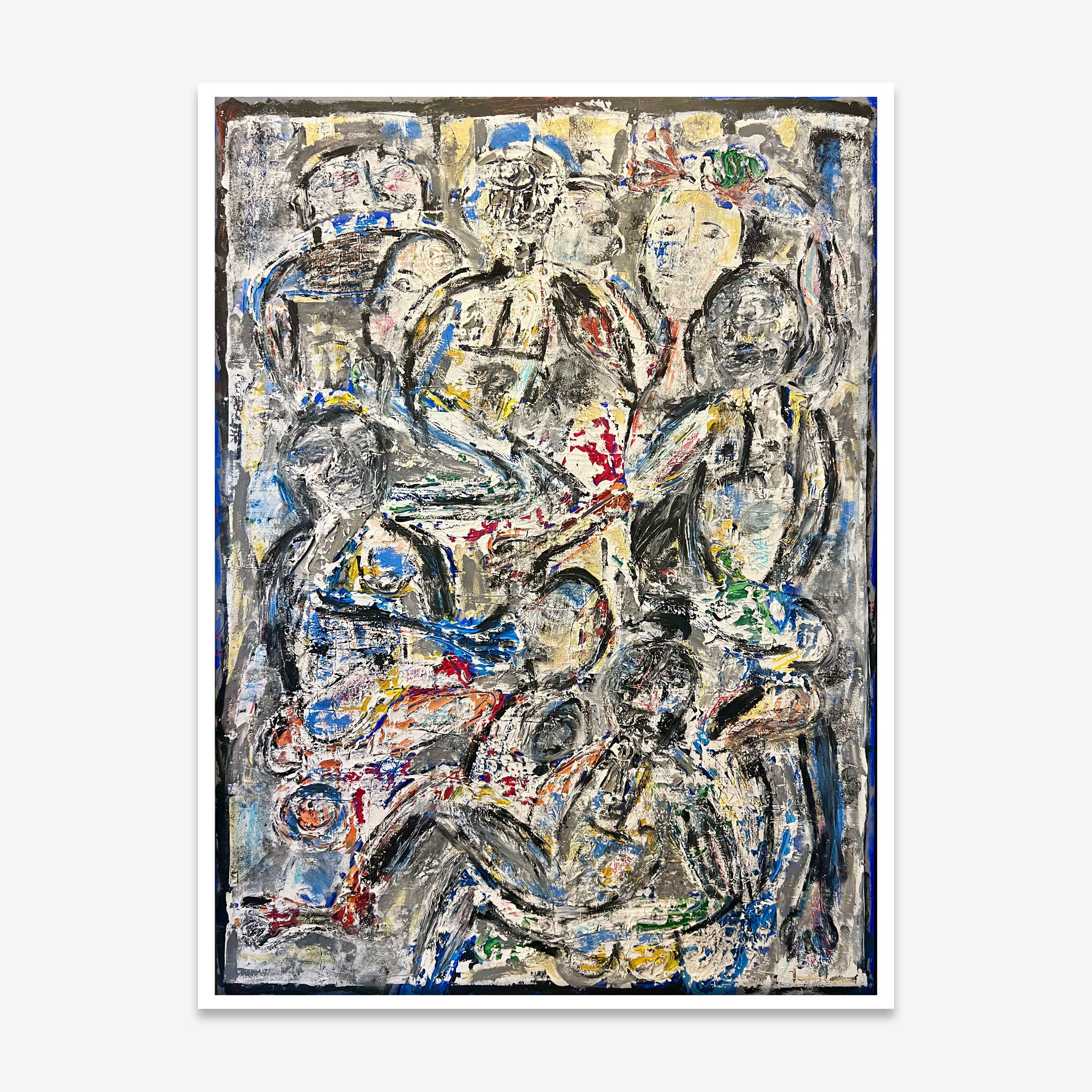 In “ÉXTASIS,” the composition features a dense, rhythmic arrangement of multiple figures and faces that seem to emerge from a pale, atmospheric void. This Héctor López Fine Art piece explores the concept of “ecstasy” as a state of sensory and spiritual overload. Furthermore, the artist uses a high-contrast palette of cool grays and charcoal blacks, punctuated by vibrant flashes of primary colors like blue, yellow, and red. Instead of following traditional figurative structures, López employs a “horror vacui” approach to fill the space with organic, intertwined forms. As a result, the painting becomes a visceral experience that reflects the complexity of identity in a fragmented modern world.