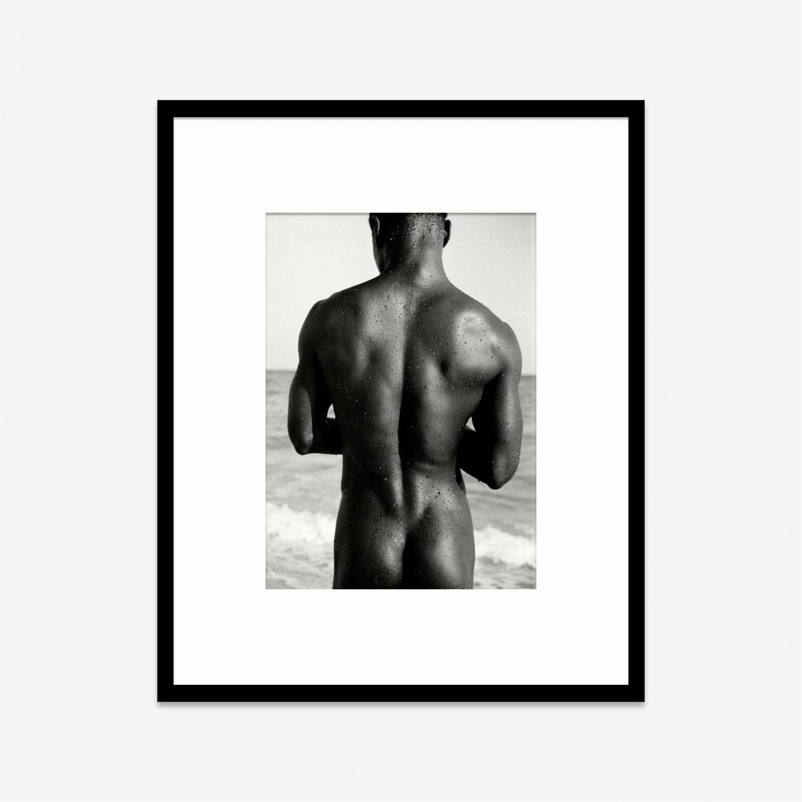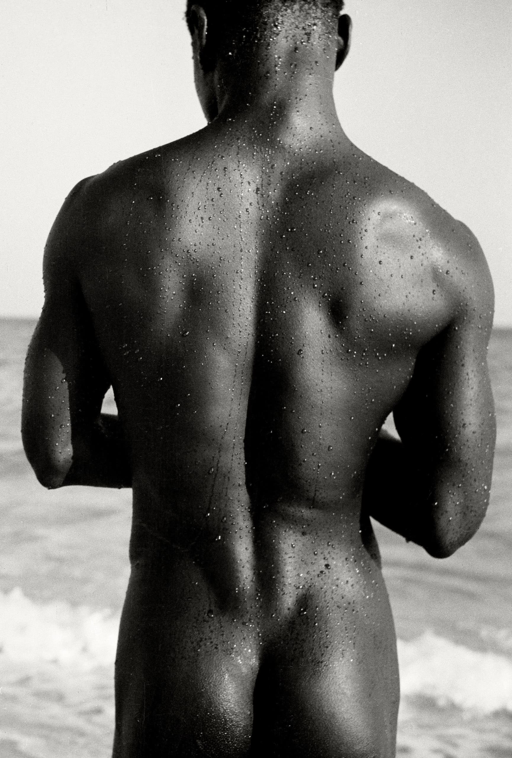 This gelatin silver print shows the back of a male figure standing by the sea. His skin is wet and covered with droplets of water, which catch the light and highlight the muscular tension of his body. The figure, turned away from the viewer, appears both sculptural and timeless. The sea in the background adds a sense of calm and eternity.