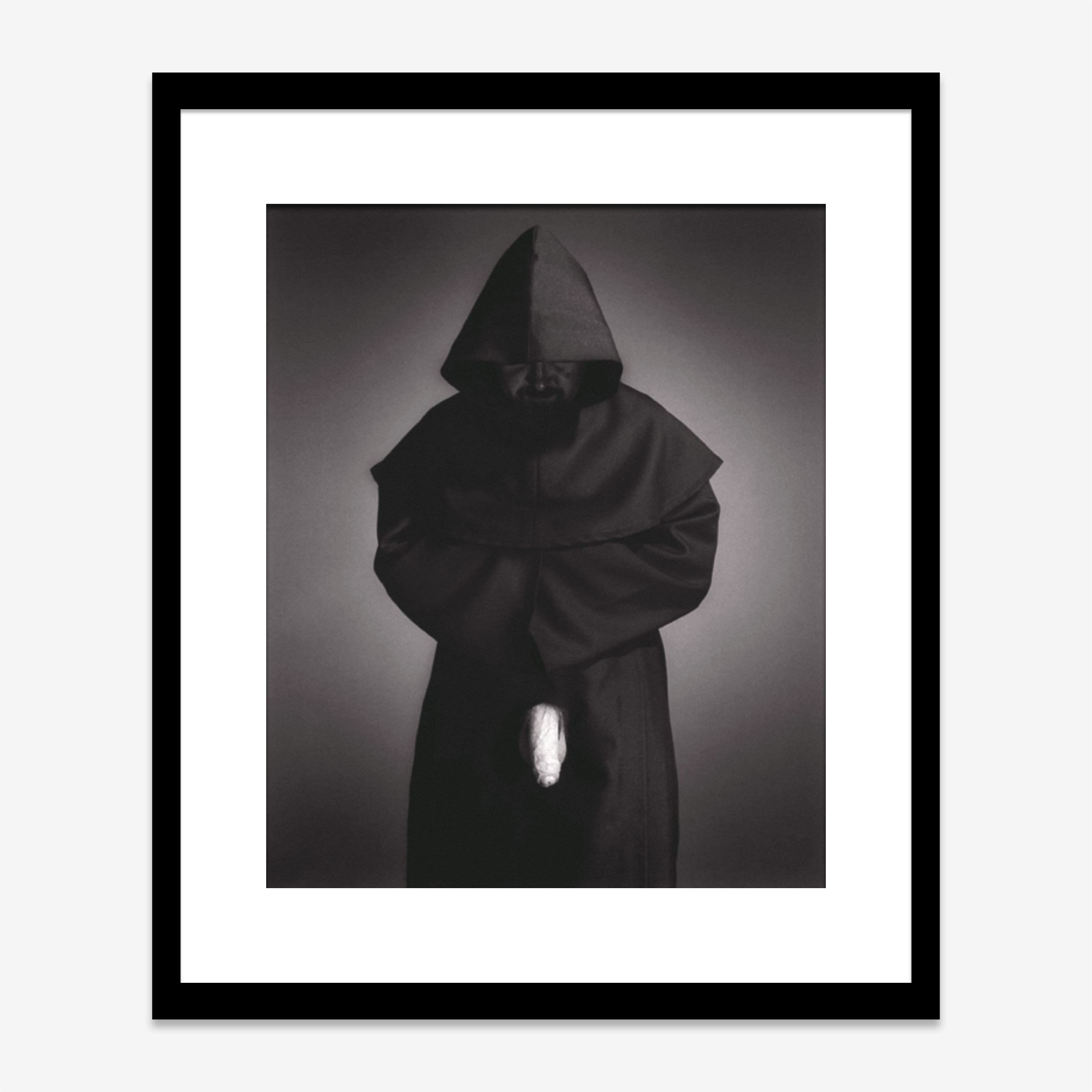 The image shows a hooded figure clad in a monastic robe, emerging from deep shadows. His face, partially obscured, evokes secrecy and introspection. Yet, the composition surprises with a provocative twist—a phallic object, wrapped and exposed, juts out from beneath the robe. This bold contrast between sacred and erotic suggests a confrontation between desire and doctrine. The photograph challenges the viewer to reconsider traditional ideas of holiness, repression, and the human body.