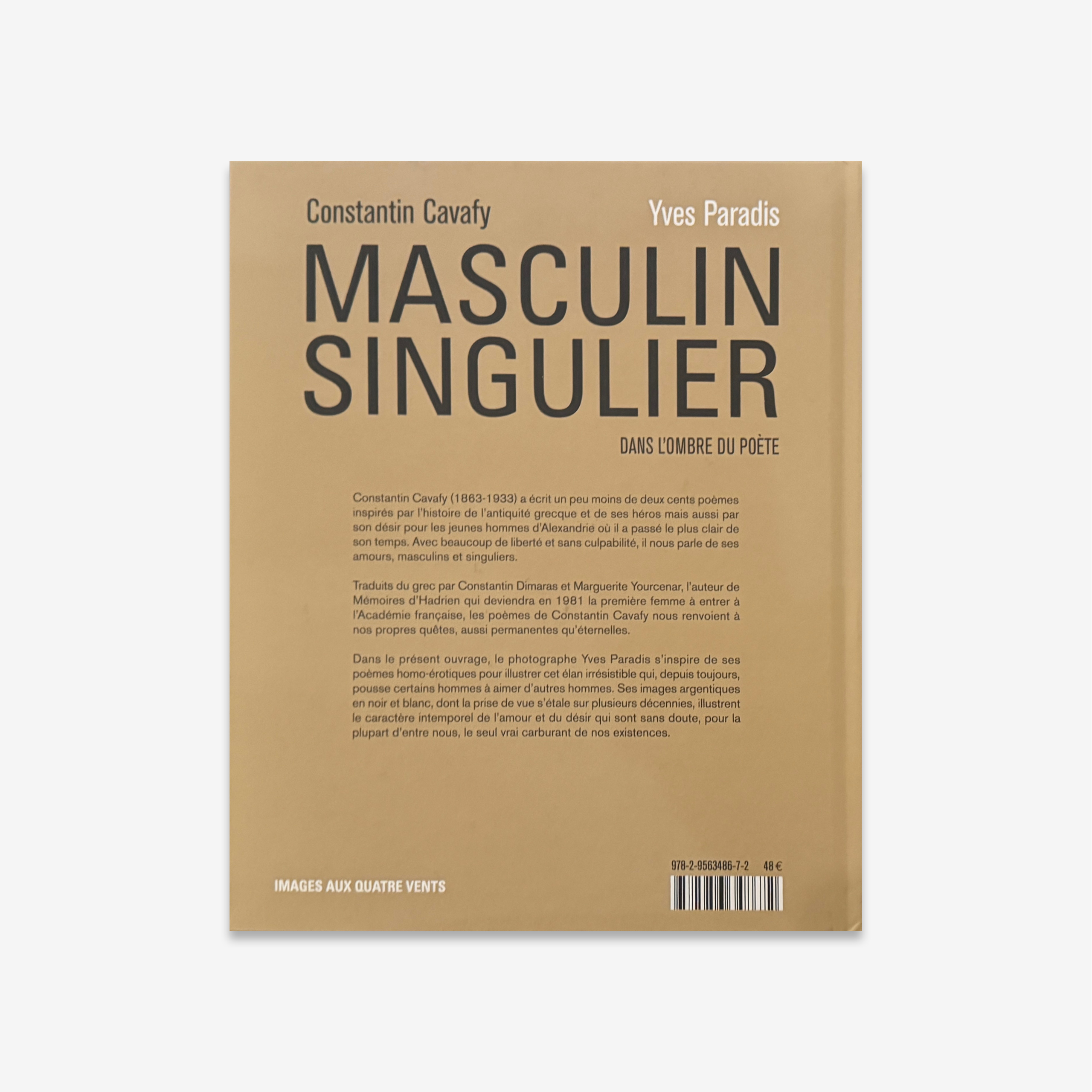 Masculin Singulier, dans l’ombre du poète brings together an uncommon dialogue between image and text, structured around eighty homoerotic poems by Constantin Cavafy and a photographic selection by Yves Paradis developed over more than five decades. The work establishes a direct correspondence between Cavafy’s poetic universe—marked by desire, memory, and evocation—and Paradis’ analytical gaze, which employs analog black-and-white photography to isolate the male body and transform it into a field of both formal and emotional inquiry. The translations by Marguerite Yourcenar and Constantin Dimaras reinforce this timeless dimension, transferring into French a body of poetry that retains its intimate intensity.