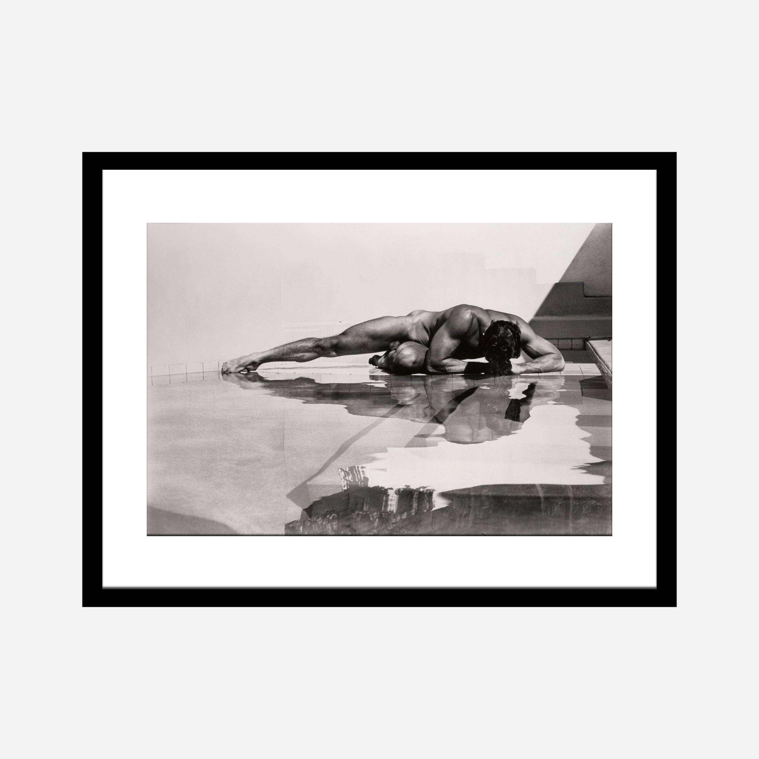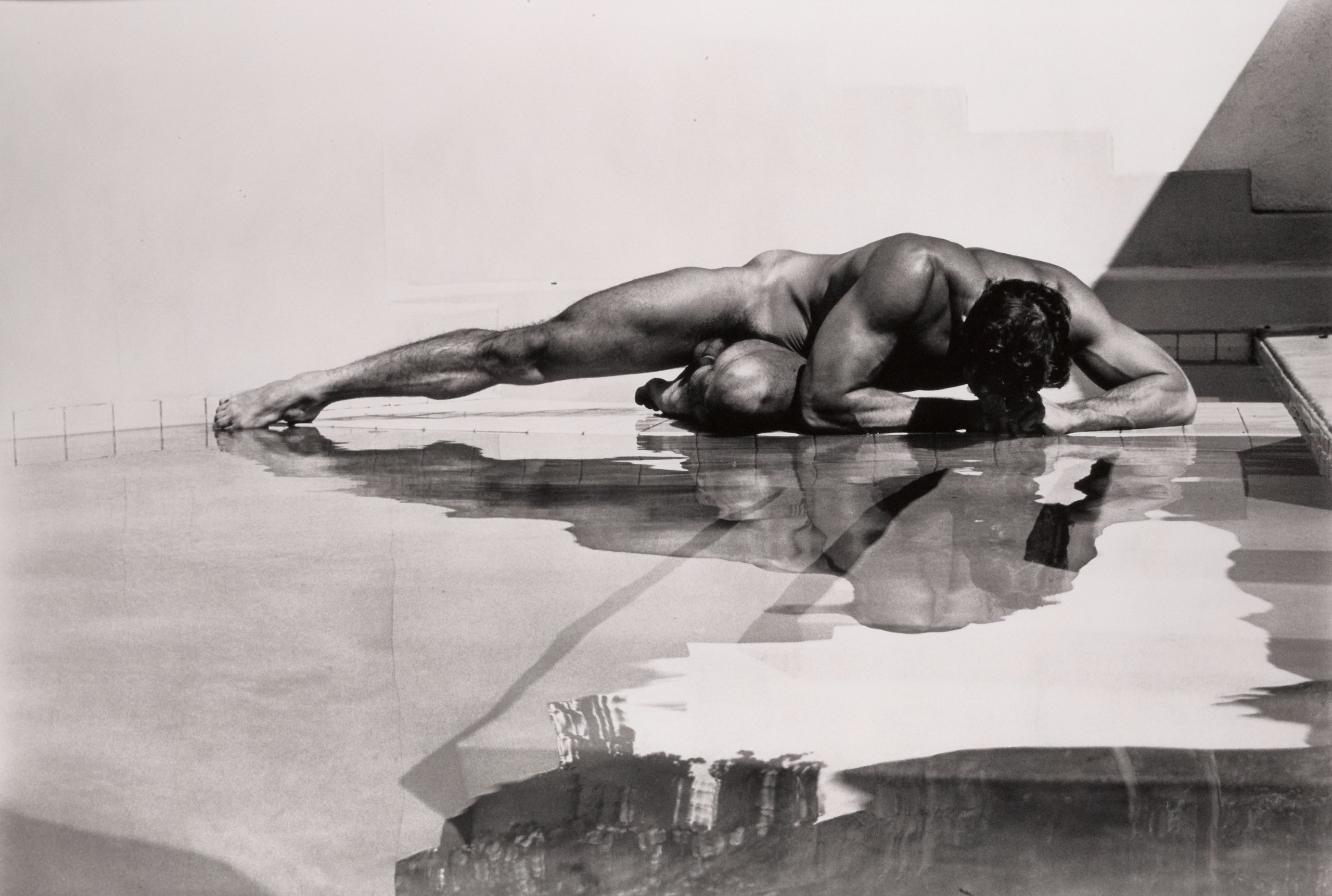 Technical Mastery of Light and Form Technically, this gelatin silver print serves as a masterclass in the management of light and reflective surfaces. Bianchi utilizes high-sunlight conditions to create deep, opaque shadows. These shadows effectively carve the subject’s musculature. As a result, the artist turns the human body into a series of interconnected volumes. A strong diagonal axis anchors the composition. This axis, created by the subject’s extended limb, leads the eye directly to the reflection in the water. Moreover, the surface of the pool acts as a secondary canvas. Here, the distorted mirror image provides a sharp textural contrast to the figure on the tile. This interplay requires precise control of exposure and timing. Therefore, the print ensures that both the skin’s highlights and the dark depths of the water retain their tonal integrity.