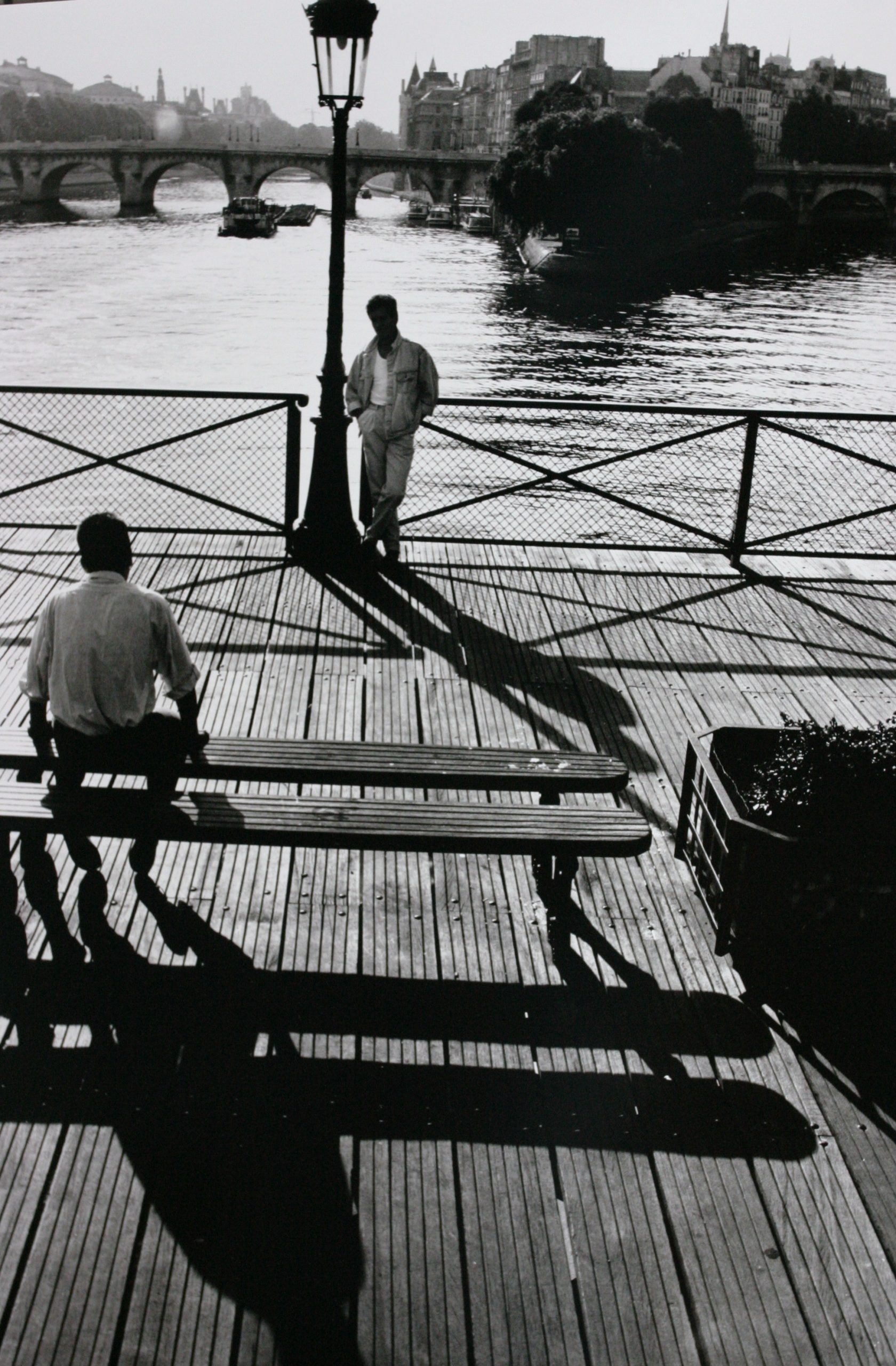The gelatin silver print emphasizes strong contrasts and fine detail. It highlights textures in the wood, water, and architecture. The composition recalls traditions of street photography and urban observation. Similar works explore public spaces through light, geometry, and fleeting human presence.